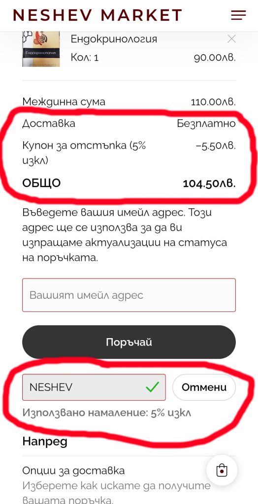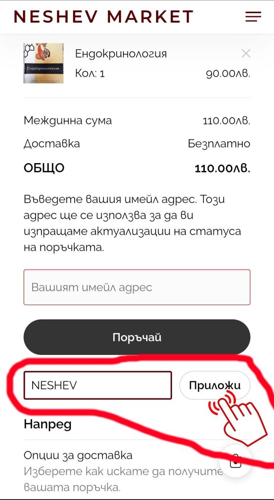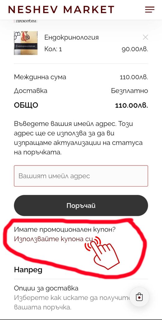 След като изберете продуктите които искате да поръчате, преди да въведете вашия имейл ще видите надпис гласящ – Имате промоционален купон? Моля натиснете на надписа гласящ – Използвайте купона си (вижте снимката отдолу)
